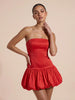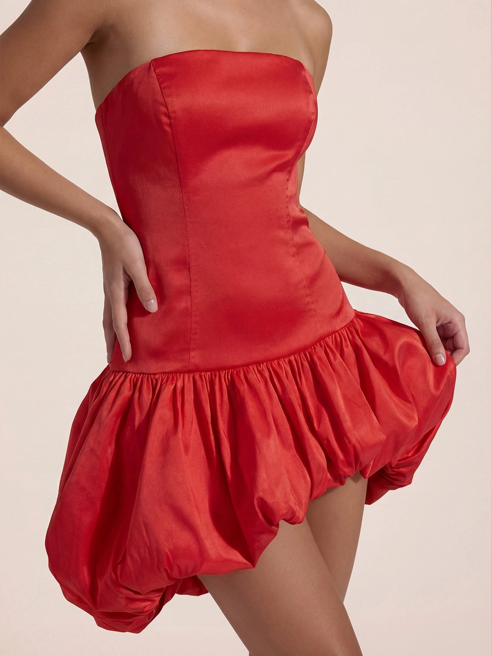 Details: Strapless, Body-con bodice with fit-and-flare transition, Voluminous gathered bubble hemline, fully lined, fire red color.