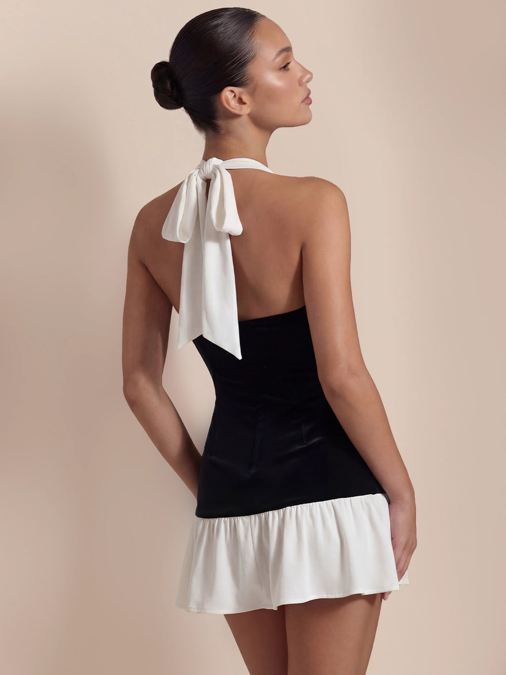 Details:Deep V halter neckline, open back, contrasting velvet and chiffon tiered skirt.