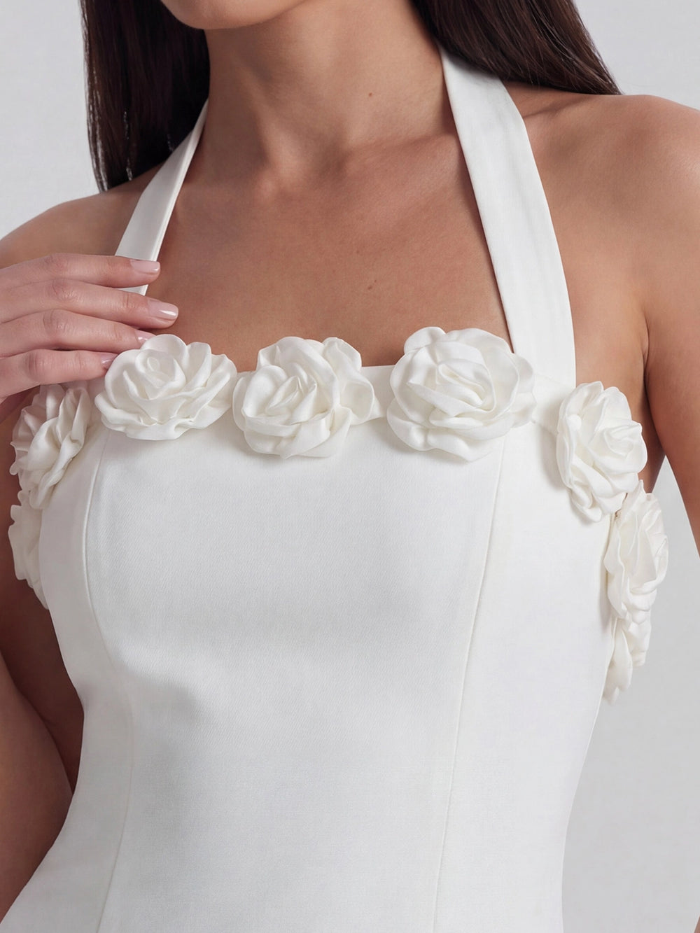 Details: Halter neckline, Open backless design, Self-tie back closures, Ruched bodice technique,Floral appliques, Invisible zip closure, Straight-cut mini hemline.