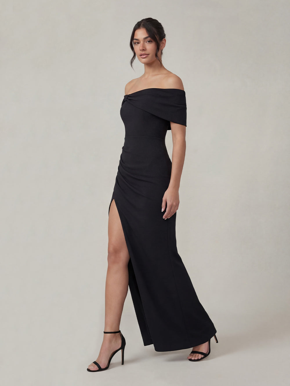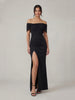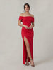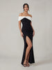 Details: Bardot bow neckline, split wrap skirt, invisible zip closure, partially lined