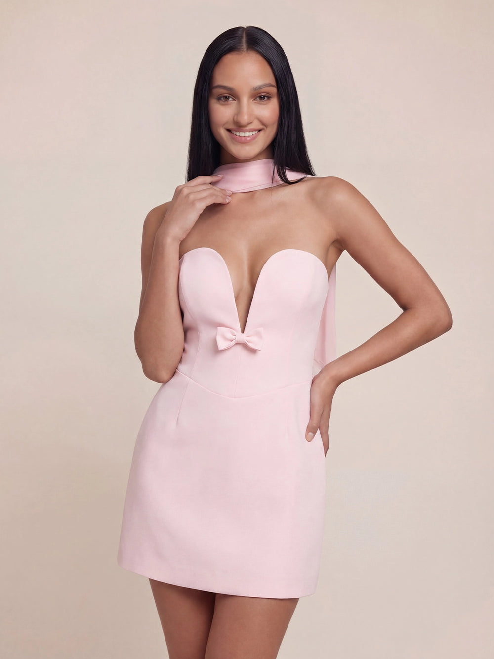 Details: Deep plunge neckline, Detachable chiffon scarf, front statement bow, strapless, back zip, fully lined