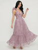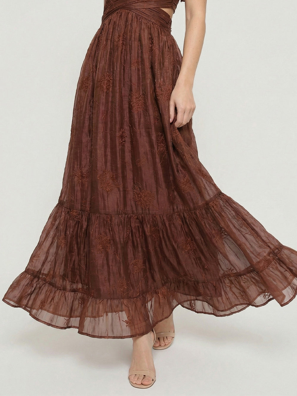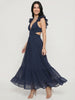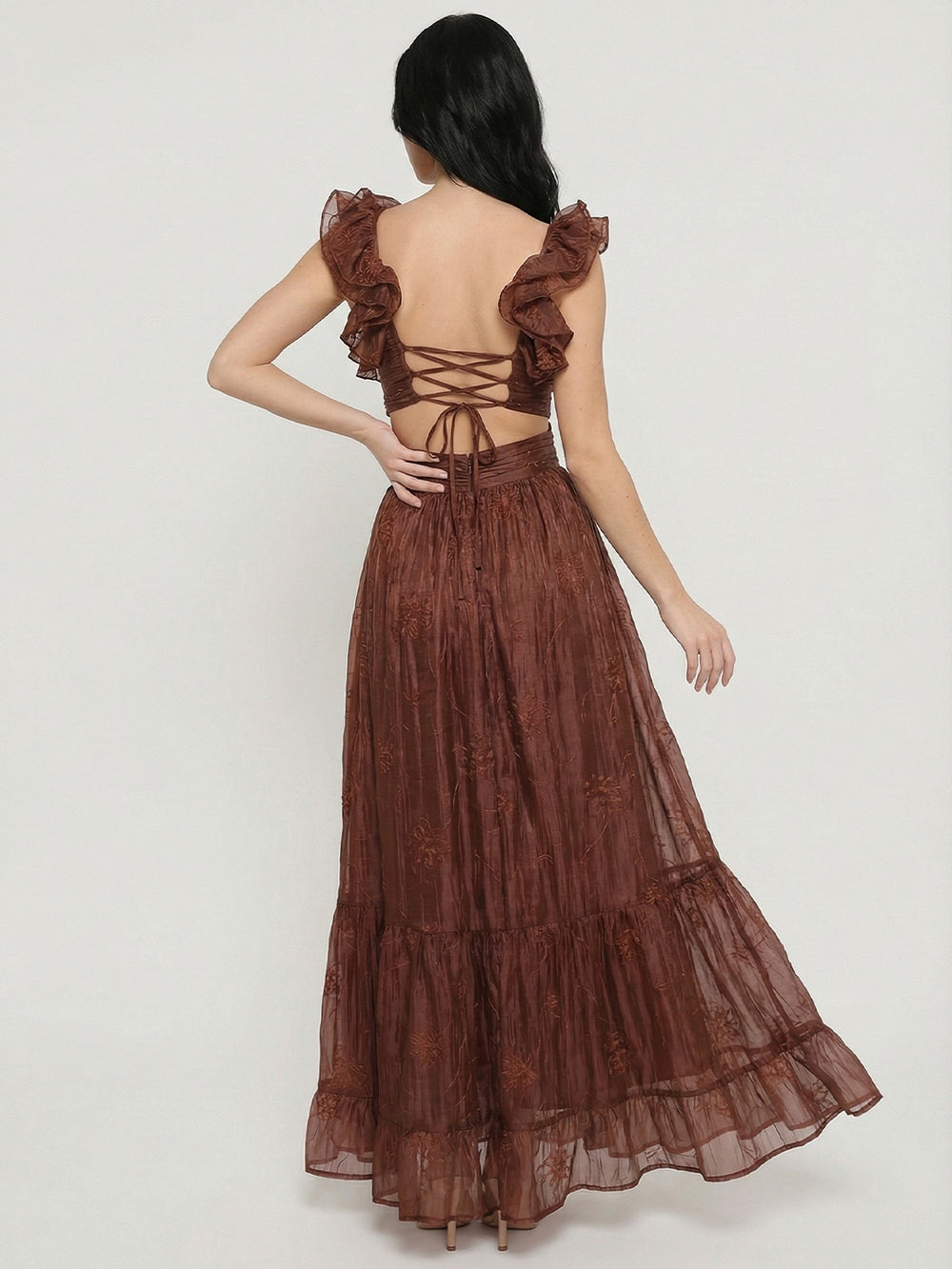 Details: V neckline, non-adjustable straps, captivating back cut-out with corset tie closure, back zip with hook-and-eye clasp, ruffle hemline, floral embroidery detail. Fully lined.