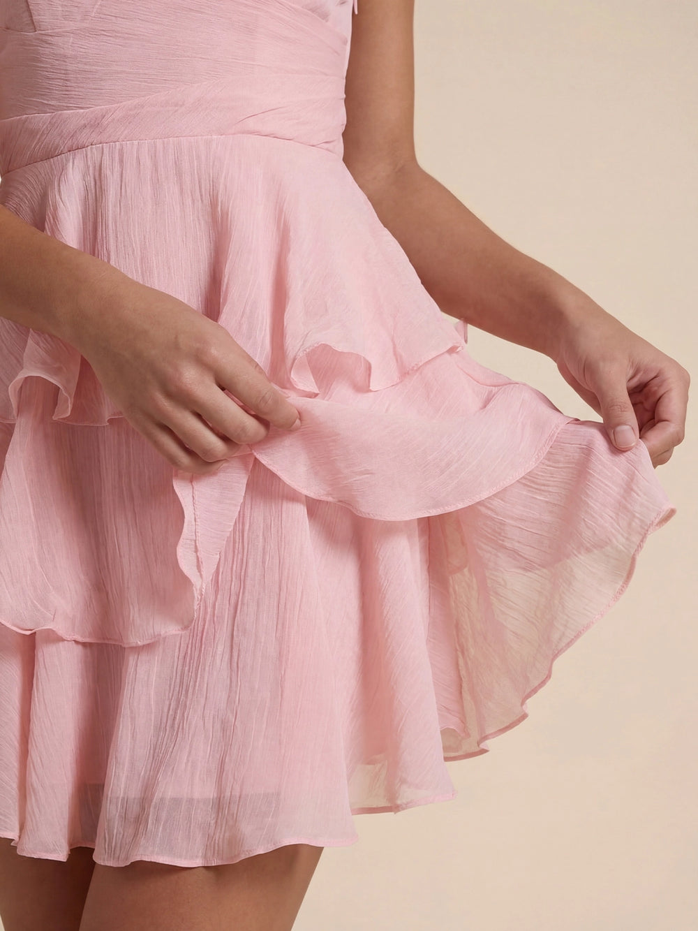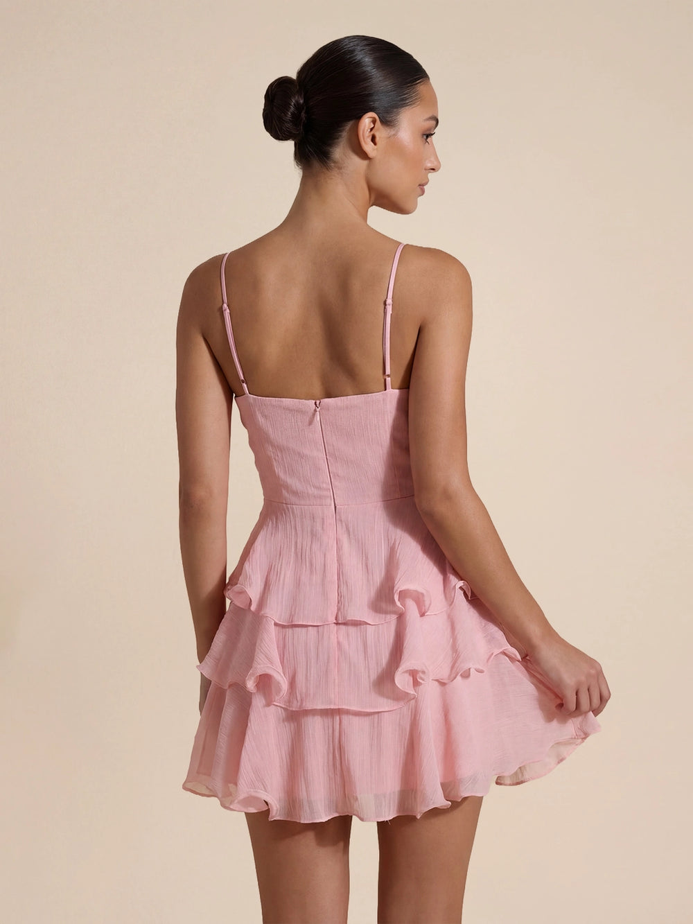 Details:Spaghetti straps, ruched waist detailing, and a flowing three-tiered ruffle hem.