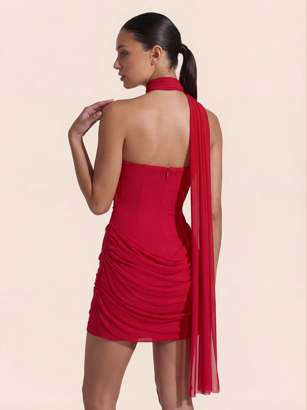 Details: Strapless corset, sweetheart neckline. Draped skirt with side pleats, attached scarf. Fully lined, invisible zip.