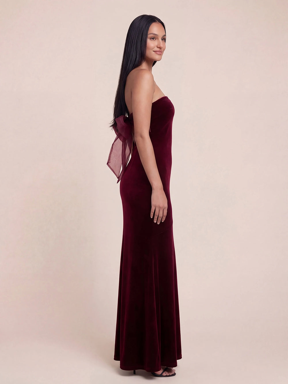 Details: Strapless tube neckline, Sleeveless, Organza bow back with bias-cut velvet craft, Flared mermaid hemline