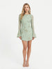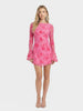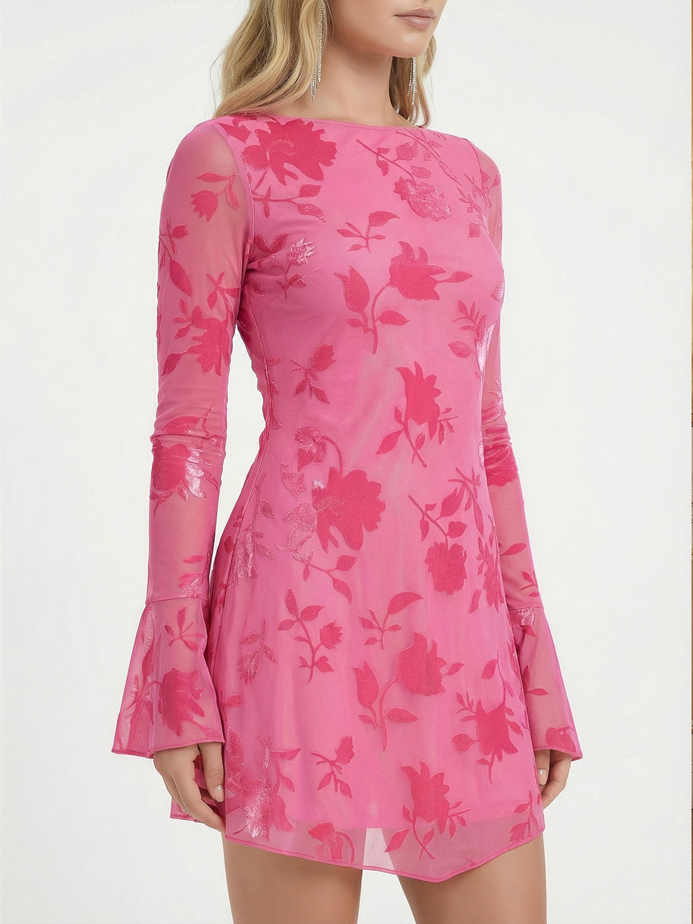 Details: Long flared sleeves with frill cuffs, backless tie-up design, slip on. Floral printed tulle.